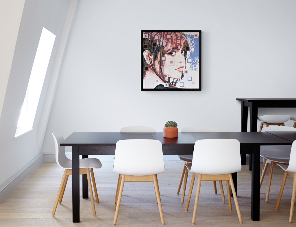 « Pay No Attention » présente un portrait saisissant qui captive par ses couleurs vives et ses formes géométriques. Le regard intense du sujet, encadré par une chevelure flamboyante, crée un contraste saisissant avec les carrés abstraits qui l’entourent. Ce jeu dynamique entre la figure et le fond invite à la contemplation, suscitant un sentiment d’intrigue et de profondeur. Idéale pour encourager le dialogue et la réflexion, cette œuvre d’art apportera une touche captivante à tout espace.