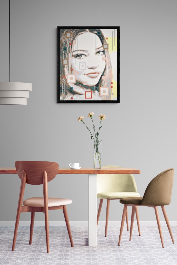 « Make You Smile » présente un portrait captivant qui fusionne harmonieusement réalisme et abstraction. Le regard intense du sujet est cerné par une multitude de formes géométriques vibrantes, instaurant un dialogue vivant entre la figure et son arrière-plan. Des teintes douces et chaudes contrastent avec des accents vifs, insufflant à l’œuvre une sensation de joie et de chaleur. Cette œuvre invite à la contemplation et apporte une touche artistique à tout espace, ce qui en fait le choix idéal pour ceux qui souhaitent égayer leur intérieur.