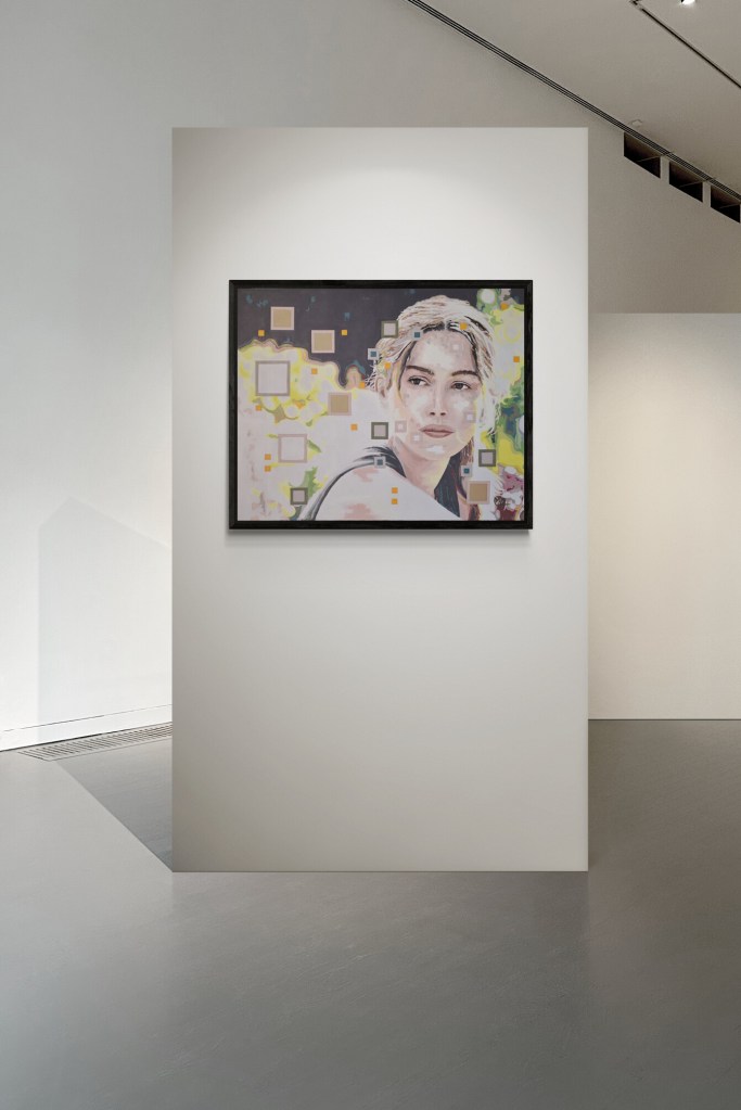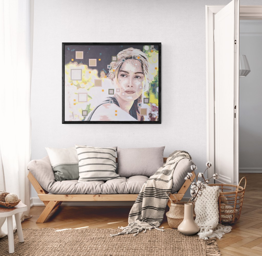 Cette œuvre met en scène une figure contemplative dont l’expression mêle introspection et force. Des formes géométriques aux tons doux l’entourent, créant un contraste dynamique qui intensifie la résonance émotionnelle de la pièce. Le jeu des couleurs et des formes invite à explorer le lien entre le sujet et son environnement. Idéale pour susciter la réflexion et l’échange, cette œuvre apporte une touche d’élégance à tout espace.
