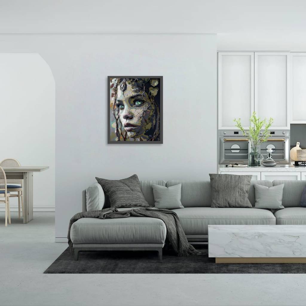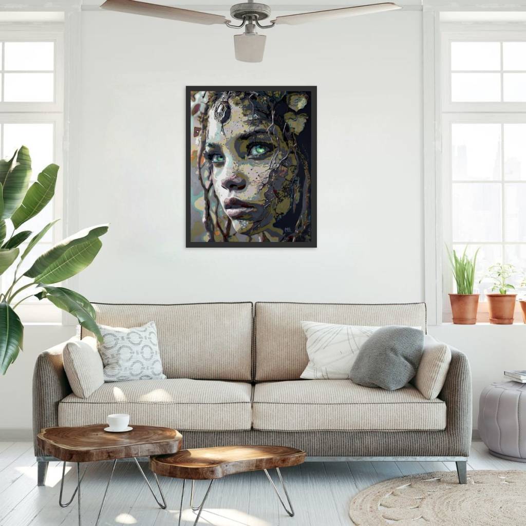 « Rooted» révèle un visage intimement lié à la nature, mêlant traits humains, textures terreuses et lignes organiques. Le regard, porté sur des yeux d’un vert saisissant, crée une impression de profondeur et de mystère. Elle invite à une douce réflexion sur le lien entre l’homme et la nature, avec une touche de modernité presque onirique.