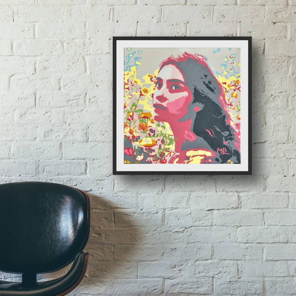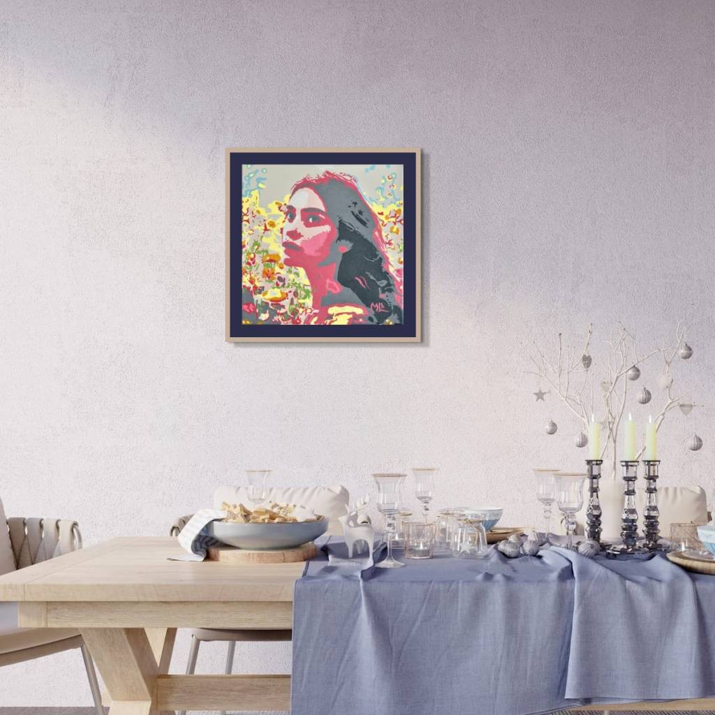 « Floral reverie » présente un portrait fleuri où des formes abstraites se fondent en de vibrants motifs floraux. Le contraste entre des roses éclatants et des gris profonds sculpte l’expression intense de la figure, tandis que des volutes de jaune et de vert suggèrent une énergie naturelle et dynamique. Cette œuvre invite à la contemplation, apportant une touche de vie et de rêverie à tout espace.